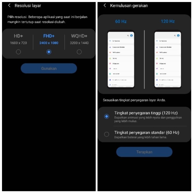 Secara default layar diatur dalam refresh rate 60 Hz dengan resolusi QHD Plus. Tapi pengguna bisa mengubah menjadi 120 Hz di resolusi Full HD Plus.