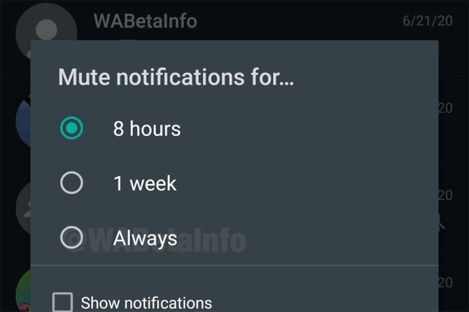 Salah satu fitur yang dikonfirmasi akan hadir pertama adalah Always Mute atau selalu bungkam. Terkadang kita yidak memerlukan pemberitahuan dari percakapan tertentu, karenanya, WhatsApp menawarkan opsi yang disebut "Mute".