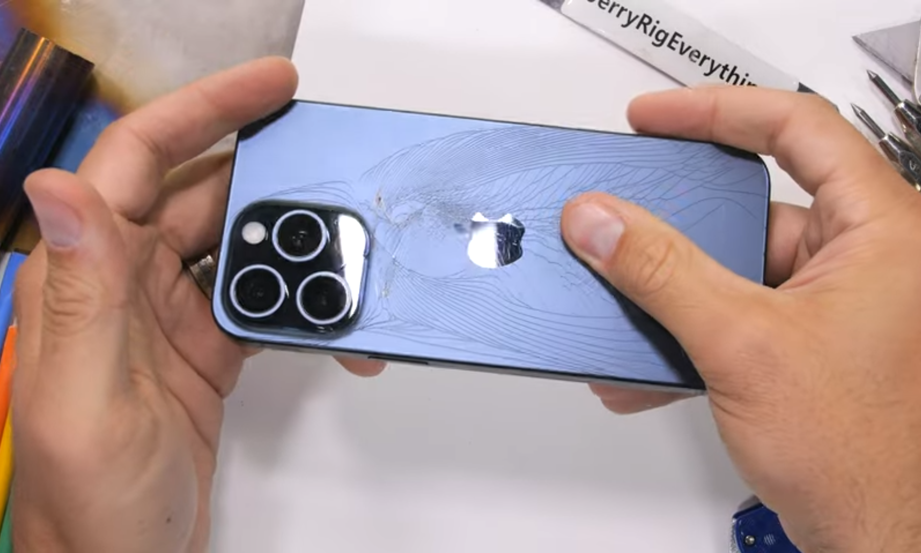 Parahnya lagi, retakan terjadi langsung di bagian belakang perangkat dimana kaca belakang terlihat retak seluruhnya dengan sebagian material kaca pecah dan terlempar keluar. Kaca area modul kamera juga retak dalam pengujian.