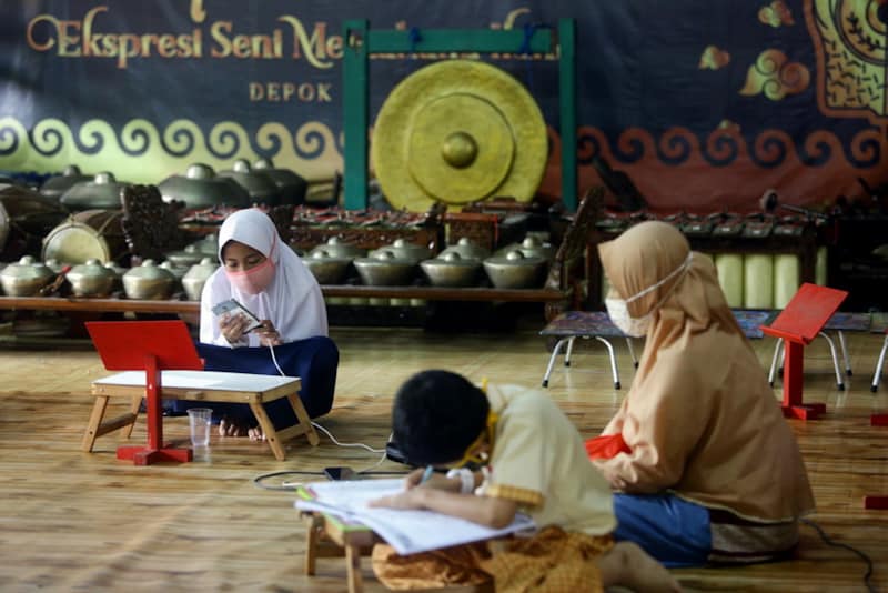 Siswa belajar secara daring didampingi relawan dari ibu-ibu PKK menggunakan fasilitas wifi gratis di sanggar Suluk Nusantara, Perumahan Depok Mulya 1, Depok, Jawa Barat, Selasa (11/8/2020). Fasilitas wifi tersebut disediakan sebagai bentuk kepedulian atas