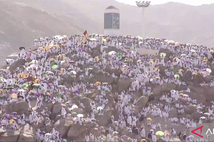 Jutaan peserta haji dari berbagai belahan dunia berkumpul di Padang Arafah untuk melaksanakan wukuf yang menjadi puncak ibadah dan sahnya haji, Selasa (27/6/2023). ANTARA