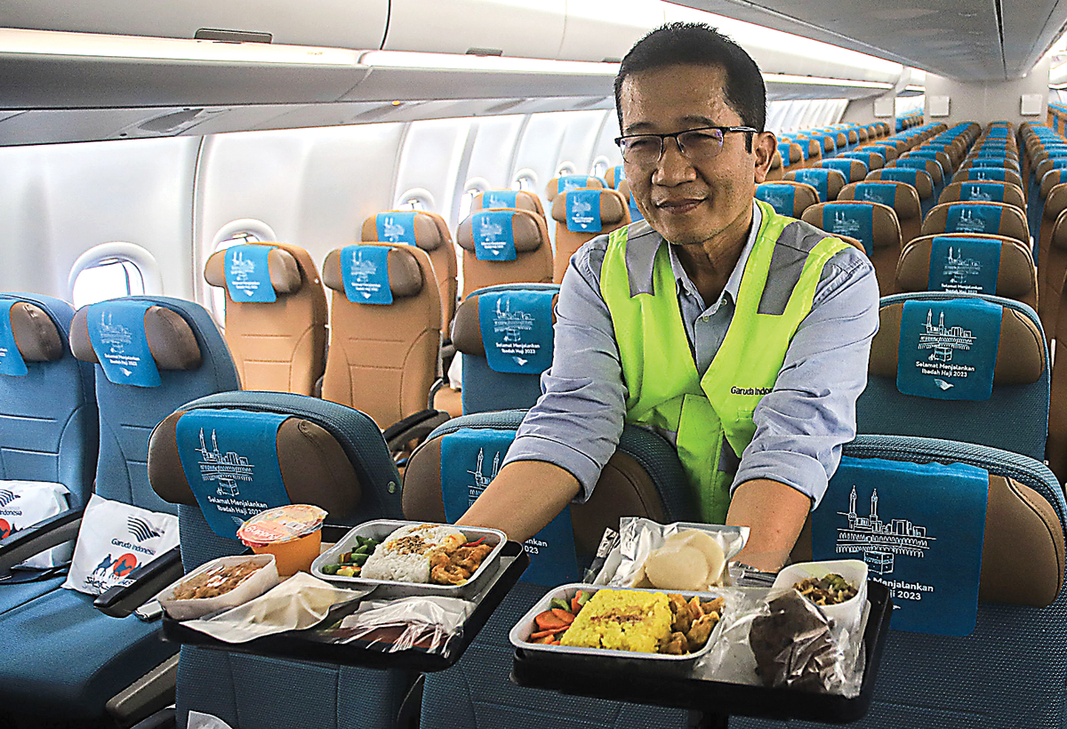 LAYANAN HAJI: Petugas menunjukkan menu makanan dalam angkutan haji di Garuda Maitenance Service Bandara Soekarno-Hatta, Tangerang.