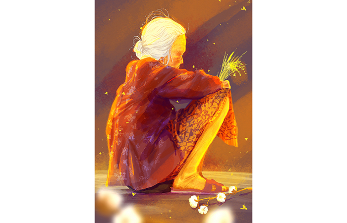 Berbeda, misalnya, dengan lukisan Ibu (1941) karya Affandi (1907–1990); wajah renta, tatapan mata seperti melamun, tangan kanan melintang di dada dengan jari-jari bergayut pada pundak kiri dilukis secara realistik. Sang ibu seperti tengah larut dalam pikiran entah apa. Dalam adegan pertunjukan wayang kulit, posisi tangan seperti itu menyimbolkan suasana duka, diteguhkan oleh suluk ngelangut ki dalang ”surem-surem dewantara kingkin…”. Suasana mirip digambarkan oleh Amang Rahman Jubair (1931–2001) pada lukisan Nenek (1976); tiga citra wajah nenek menatap jauh dan kosong dalam suasana surealistik. Dua lukisan itu menggugah rasa haru karena terbayang relasi anak dengan ibunya atau cucu dengan neneknya. Kedekatan yang tak tergantikan.