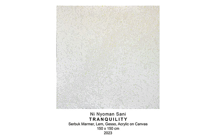 Nah, pada karya lukis Nyoman Sani yang elemen rasa menginspirasikan bidang putih yang luas di mana keheningan menjadi keniscayaan. Munculnya titik-titik hijau merupakan eksplorasi Nyoman Sani dengan medium phosphorescent yang menyala saat gelap.
