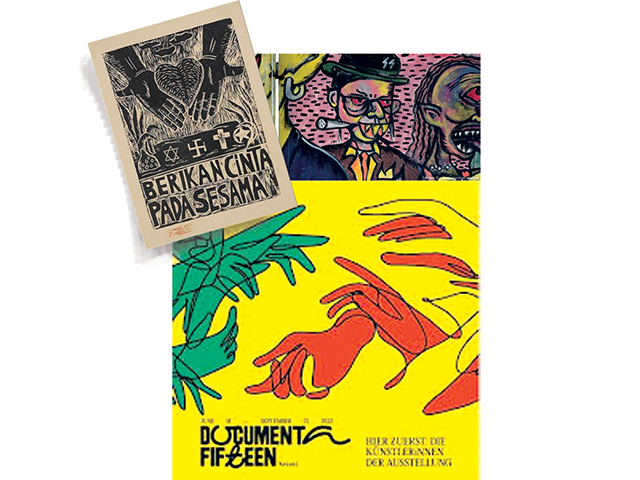 KEHEBOHAN Documenta 15 dipicu skandal anti-Yahudi yang dianggap direpresentasikan baliho People’s Justice (”Keadilan Rakyat”) karya kelompok Taring Padi. Karakter bergigi tajam bertopi simbol SS (pasukan khusus Nazi-Hitler) dengan kucir kuris di pelengan wajah dan karakter berwajah babi dengan syal bintang Daud berhelm bertulisan ”mossad” pada ”Keadilan Rakyat” dinilai mengekspresikan sikap anti-Yahudi.