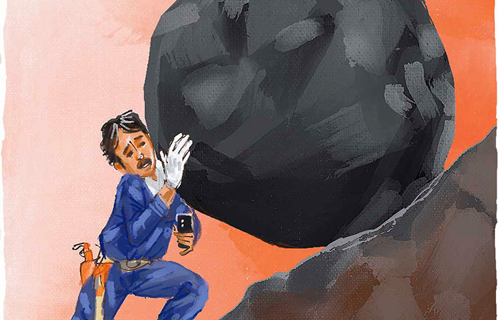 Tentu, laku ora umum ketiga tokoh kita bertabrakan dengan kaum karbitan yang kini memboyong batu Sisifus dengan buldoser. Di gunung seberang, Hirayama, Maharlikha, dan Senda mendorong batu Sisifusnya sambil bersiul bersama Louis Armstrong, ”Kutatap langit biru, awan putih, hari cerah, serta malam suci nan legam. Lalu, kuberbisik pada diri, Betapa indahnya dunia.”