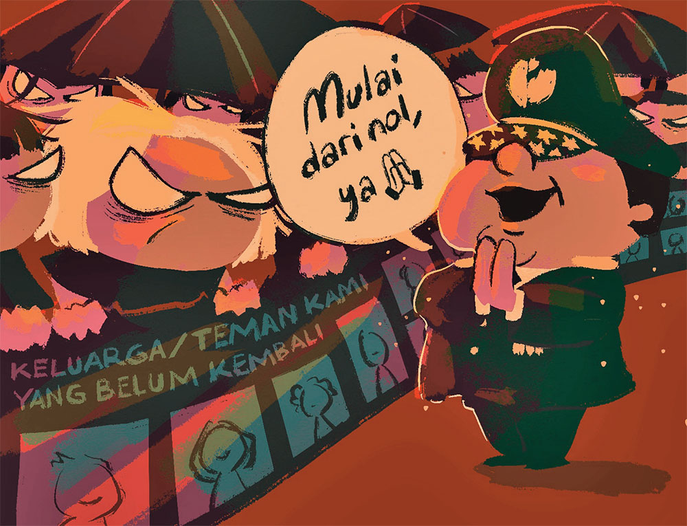 Bagi pegiat HAM di Indonesia, mendengar amanat presiden seperti ini bisa remuk hatinya karena tahu Indonesia adalah negeri yang sebagian besar tak pernah bisa menyelesaikan persoalan HAM dan penindasan di negerinya sendiri. Menyentuhnya pun tidak. Sebuah negara yang angkatan perangnya dengan enteng bisa ”menyelesaikan” soal genosida politik lewat halalbihalal, lewat pemampangan baliho dan iklan layanan masyarakat ”Selamat Idul Fitri”.
