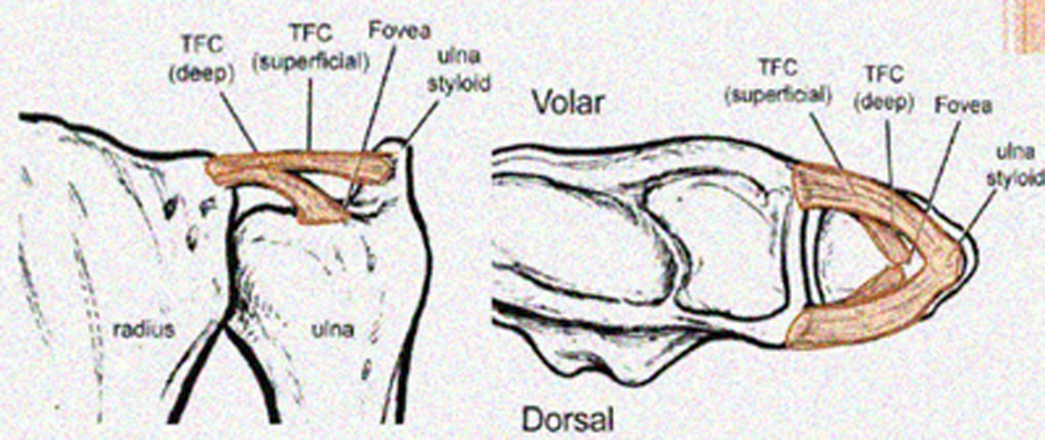 Struktur ini dinamakan Triangular Fibro Cartilage Complex atau TFCC yang berperan penting pada banyak pergerakan terutama saat seseorang memutar pergelangan tangan dan saat membengkokkan pergelangan tangan ke arah kelingking atau yang dinamakan ulnar deviasi.