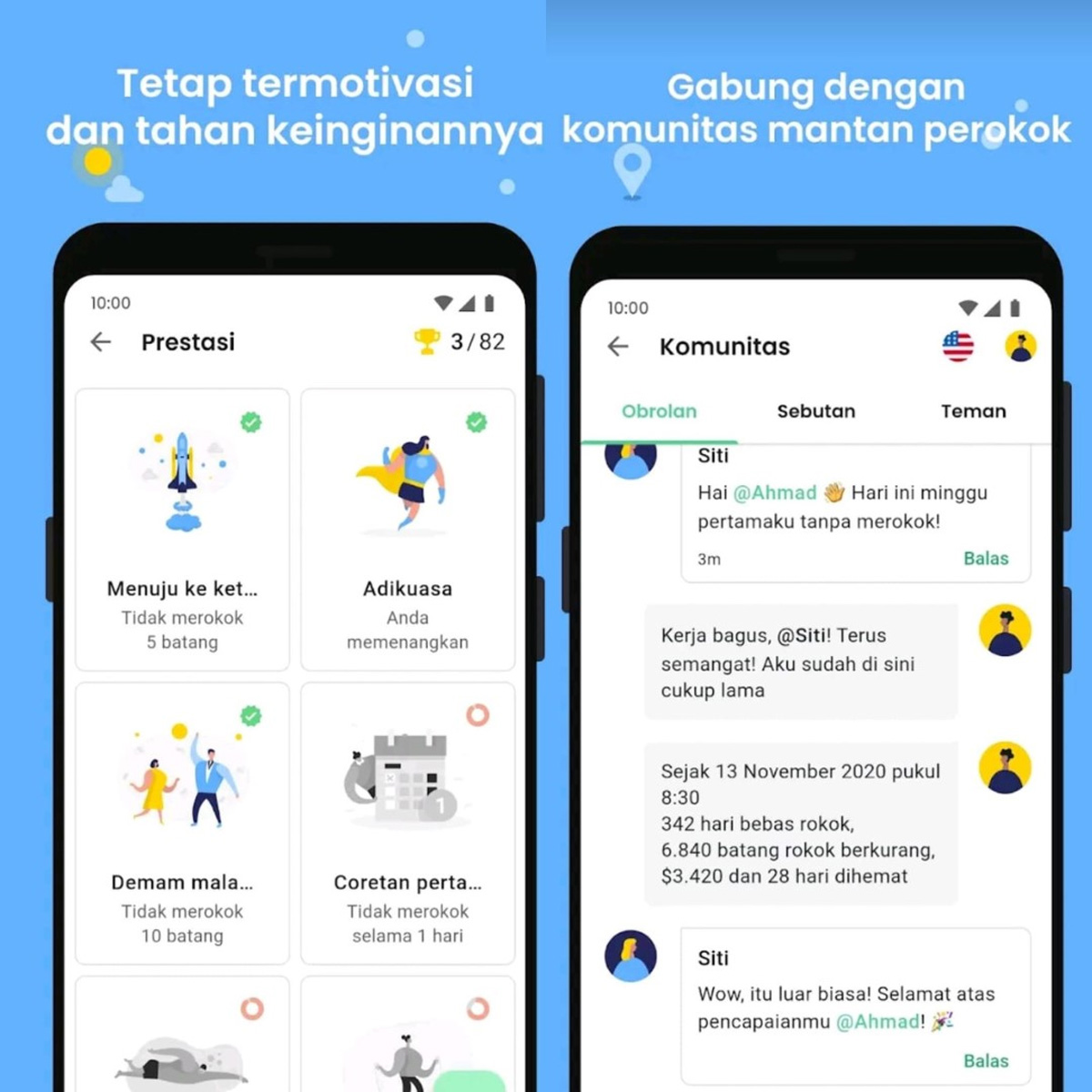 Menariknya, QuitNow juga memberikan penghargaan kepada pengguna yang berhasil berhenti merokok atau membantu orang lain untuk berhenti, sehingga motivasi untuk berhenti tetap terjaga.