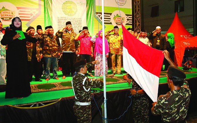 HORMAT: Banser mengibarkan sang saka Merah Putih diiringi lagu Indonesia Raya dengan aransemen musik hadrah.