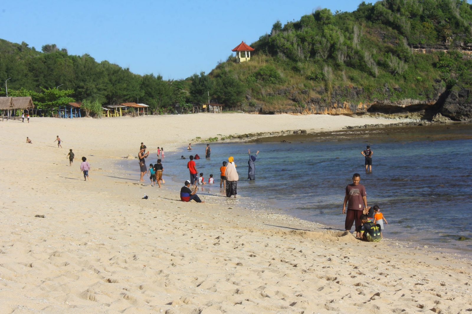Beberapa pengunjung Pantai Watukarung, Pringkuku, Pacitan bermain air di tepi pantai pada hari pertama Ramadan kemarin (6/5). Sugeng Dwi Nurcahyo/Radar Madiun