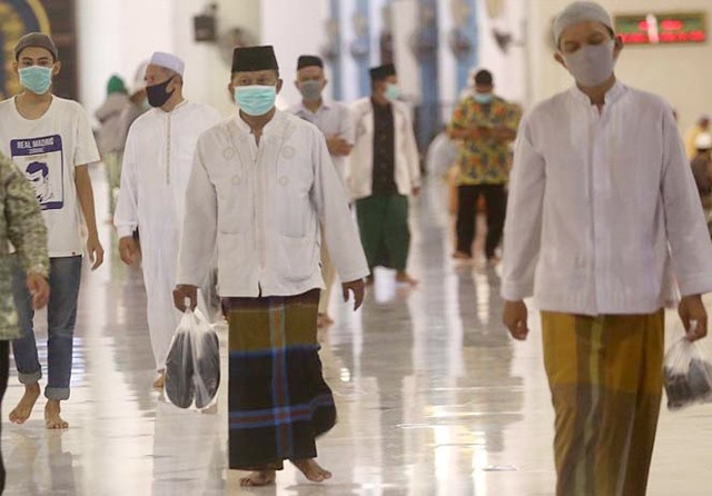 RELAKSASI TEMPAT IBADAH: Jamaah salat Isya dan Tarawih di Masjid Al Akbar Surabaya harus mematuhi protokol kesehatan. Mereka harus membawa alas kaki masing-masing untuk menghindari kerumunan saat meninggalkan masjid dan melalui pemeriksaan suhu tubuh. (Ri