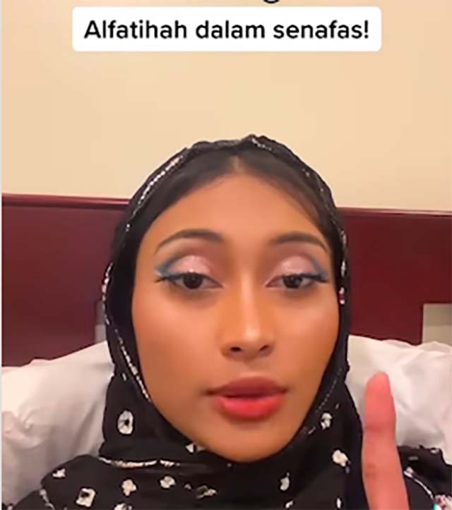 “Gaes udah lama pengin coba ini, Al-Fatihah dalam satu nafas, bismillahirrahmanirrahim kita coba,” kata Novia yang mengenakanbaju biru dipadu jilbab hitam dalam video tersebut. Novia pun lalu membaca surat yang menjadi bagian dari Surat Al-Baqarah tersebut.