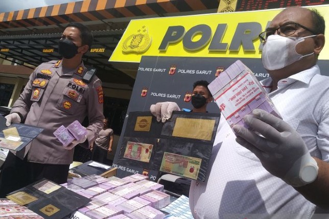 Polisi menunjukkan barang bukti dalam kasus pengungkapan uang palsu di Markas Polres Garut, Jawa Barat, Minggu (20/11). Feri Purnama/Antara