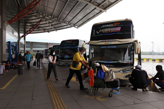Sejumlah calon penumpan menunggu kedatangan bus AKAP di Terminal Terpadu Pulo Gebang, Jakarta, Kamis (23/12/2021). Memasuki periode Natal 2021 dan Tahun Baru 2022, suasana di terminal tersebut mulai ramai penumpang dengan tujuan kota-kota besar. Foto: Der