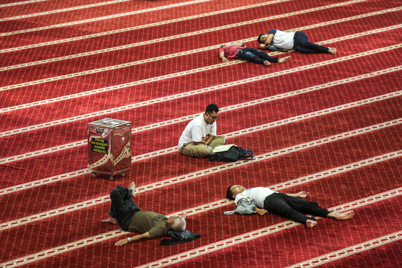 Umat muslim melakukan aktivitas membaca alquran dan beristirahat di Masjid Istiqlal, Jakarta Pusat, Selasa (2/4/2024).