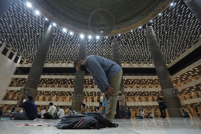 Umat muslim menjalankan ibadah Shalat Tarawih di Masjid Istiqlal, Jakarta, Senin (12/04/2021) malam. Pemerintah menetapkan awal puasa atau 1 Ramadhan 1442 Hijriah jatuh pada Selasa, 13 April 2021 berdasarkan keputusan bulat dari berbagai ormas islam hingg