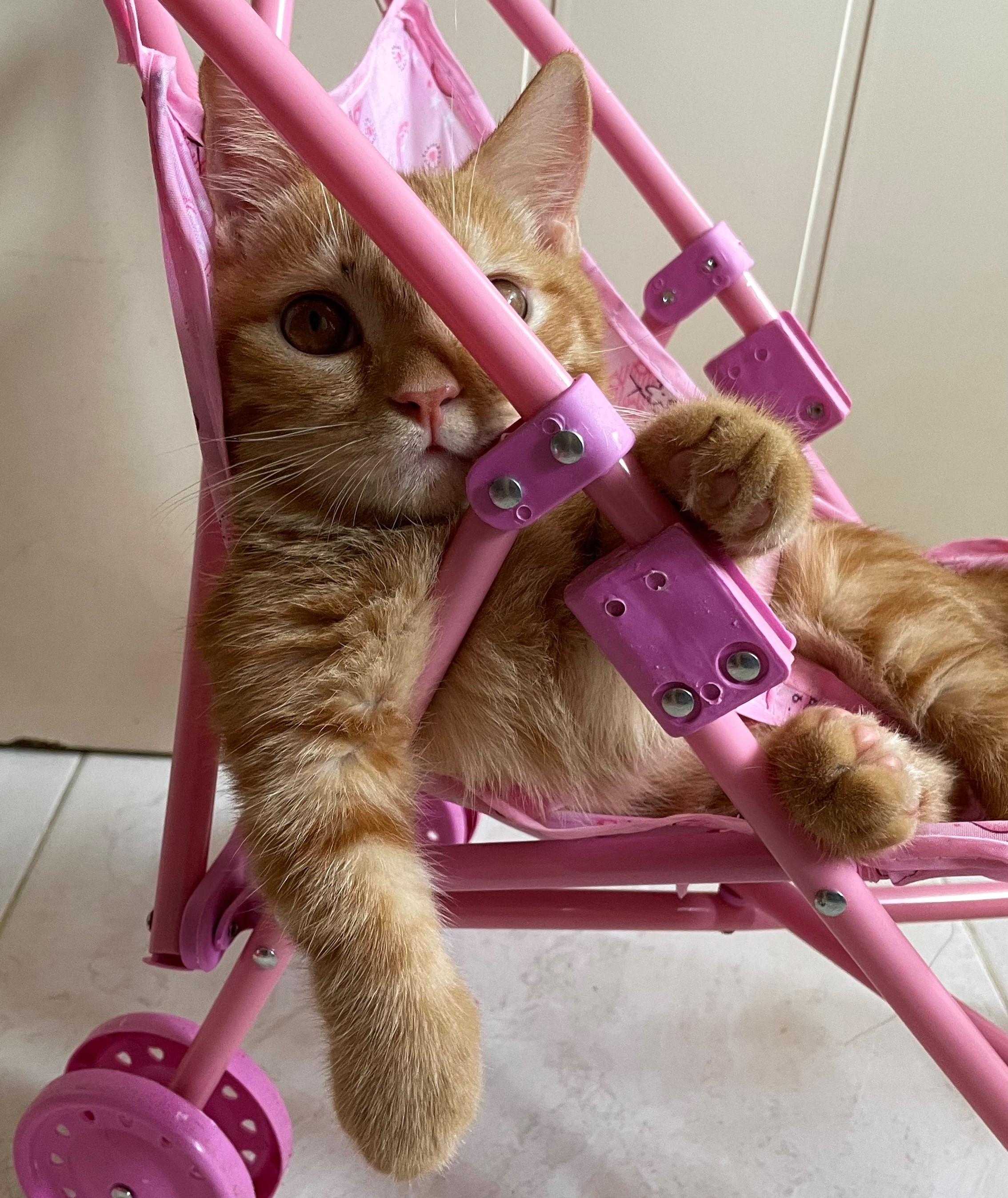 Dodo enjoy di dalam stroller pink-nya. Vien mengadopsi Dodo di usia 3 bulan.