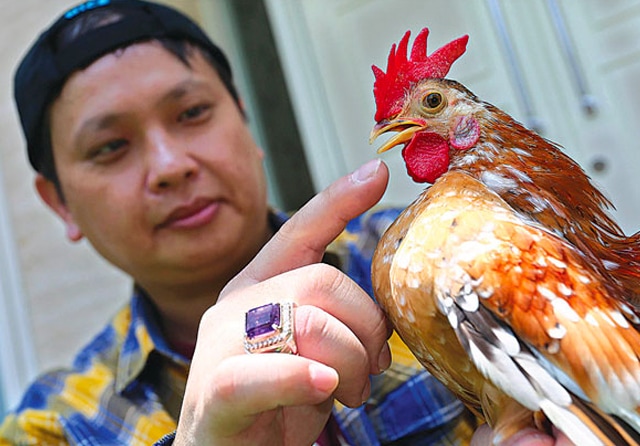 PERAWATAN KHUSUS: Guantoro dan salah satu ayam serama peliharaan- nya. Pembentukan postur yang tegak menjadi poin penting. (Robertus Risky/Jawa Pos)