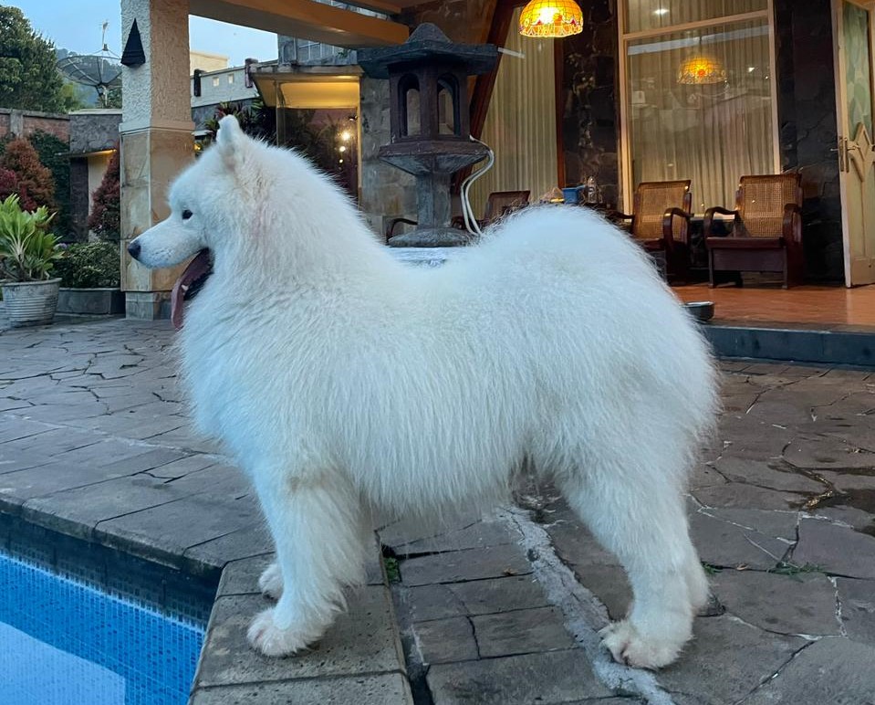 Salah satu samoyed kesayangan Johannes Salindeho berfoto di belakang rumahnya.