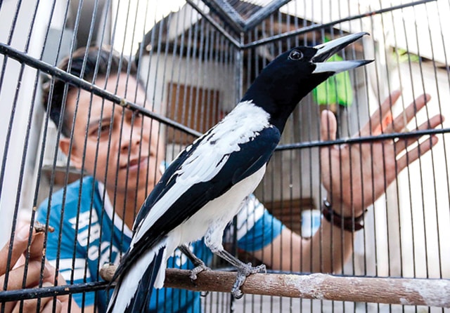 BUTUH INTERAKSI: Menjinakkan Jagal Papua membutuhkan ketelatenan. Menyuapi burung dengan jangkrik bisa membuatnya dekat dengan pemiliknya. (Alfian Rizal/Jawa Pos)