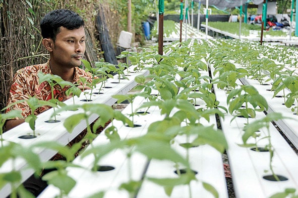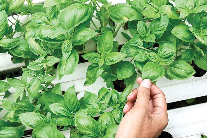 TIGA BULAN SIAP PANEN: Pengelola Kabun Sayur Surabaya Mehdy Riza menunjukkan penanaman basil di kebun tersebut. Agar tumbuh subur, digunakan air yang didinginkan dengan mesin AC. (ALFIAN RIZAL/JAWA POS)