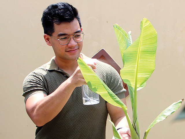 PERAWATAN MUDAH: David Bernando menunjukkan salah satu koleksi tanaman pisang miliknya. Tanaman ini jangan terkena matahari langsung agar tak sobek daunnya. (FRIZAL/JAWA POS)