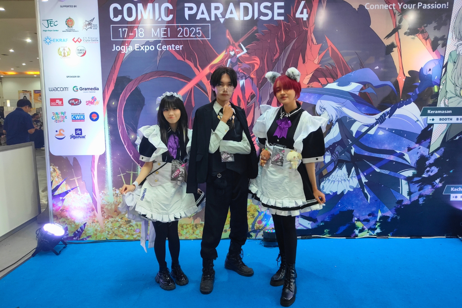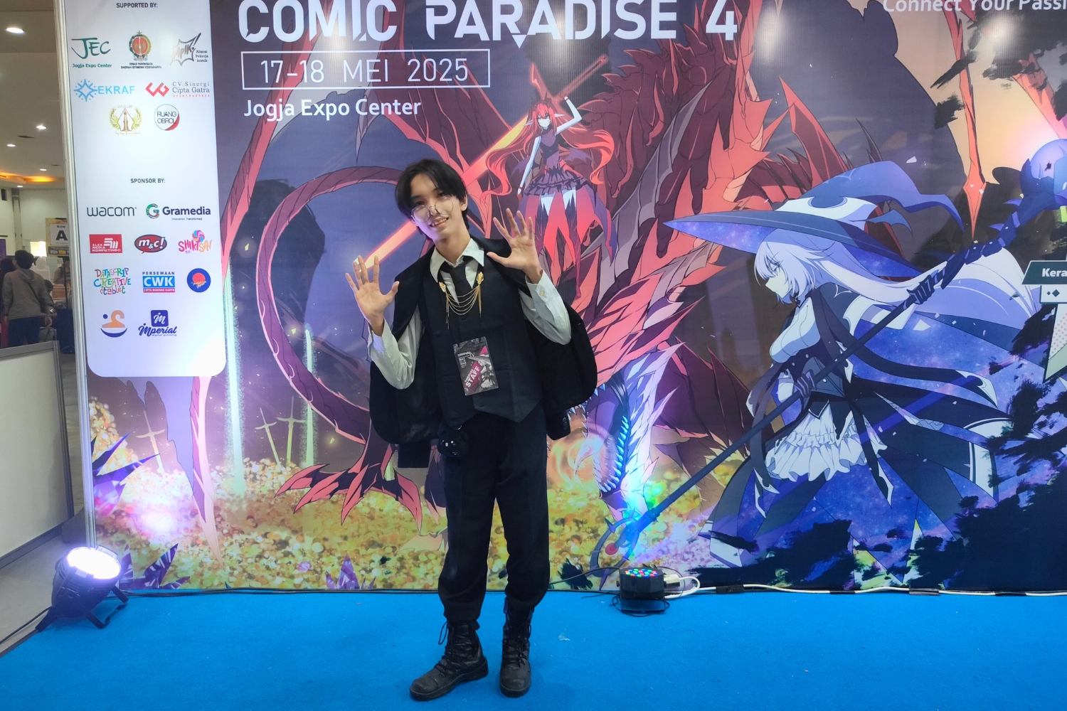 Meiza Muhammad Rizqi dikenal sebagai cosplayer berpengalaman yang kini tampil sebagai butler dalam Comipara 4. Kostumnya terdiri dari kemeja putih, jas gelap, dan vest, mencerminkan karakter pelayan pribadi khas anime.