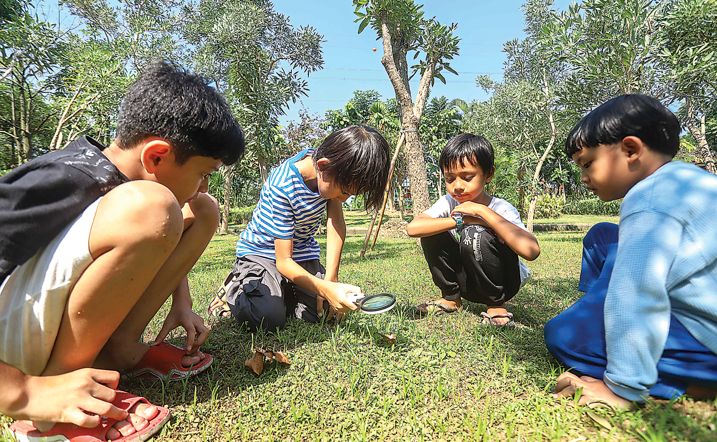 PANAS: Anak-anak mengamati proses pembakaran daun kering dengan menggunakan lensa pembesar.