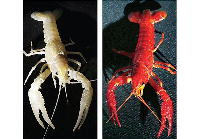 MENYALA: Snow white clarkii (kiri) dan red marlboro clarkii, lobster hias air tawar, yang diminati penghobi ikan hias karena warnanya mencolok. (Guslan Gumilang/Jawa Pos)