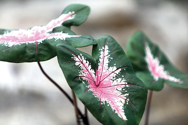 DISUKA IBU-IBU: Warna Caladium baret dan keladi Ace of Heart mencolok. Keladi tersebut juga populer di kalangan penghobi. (SALMAN TOYIBI/JAWA POS)