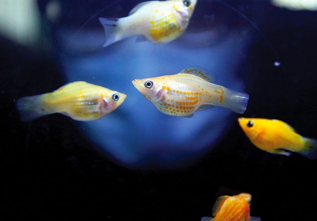 MENGGEMASKAN: Ikan golden molly dipajang di Larizki Fish, kawasan Pamulang, Tangerang Selatan, Minggu (7/2). (Salman Toyibi/Jawa Pos)