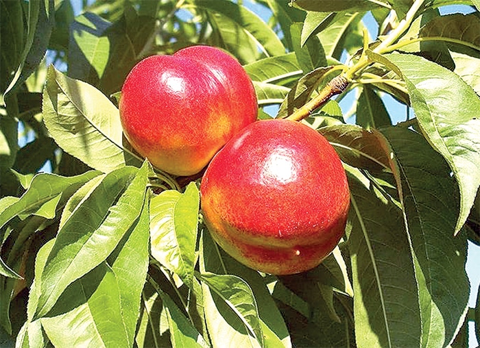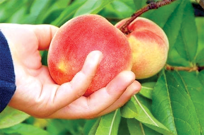 WARNA DAN RASA SEGAR: Neuctarine peach dan peach Holland. Neuchtarine tidak memiliki bulu pada kulit buah, sedangkan peach Holland berbulu dengan warna merah semburat kuning. (IG HOMEGARDEN 34)
