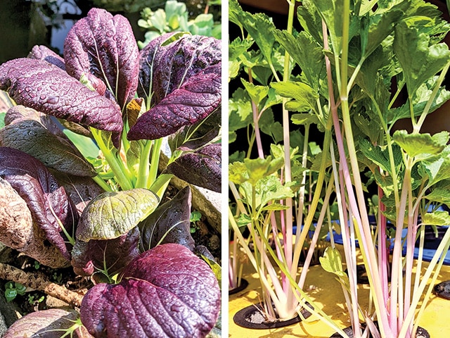 DITANAM DARI BIJI: Beberapa tanaman ungu sukses ditanam Shinta Amalia. Di antaranya, kacang koro, pakcoy, dan seledri batang ungu. (SHINTA AMALIA FOR JAWA POS)