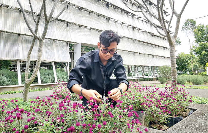 PERAWATAN MUDAH: Nikolas Baruna Citraka memotong daun dan bunga kenop. (JAWA POS)