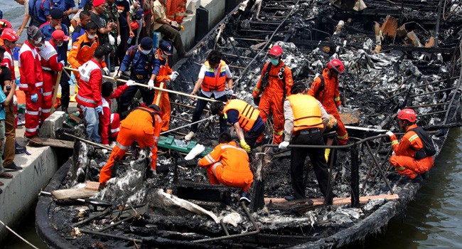 Evakuasi mayat korban kapal wisata Zahro Express dan sebanyak 20 Kantong Jenazah Dibawa Keluar dari Kapal Wisata yang Terbakar di 1 mil dari pelabuhan Kali Adem Muara Angke Jakarta Utara.