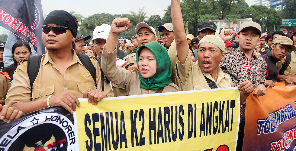 Para tenaga honorer K2 saat melakukan aksi unjuk rasa untuk menuntut agar diangkat menjadi PNS.