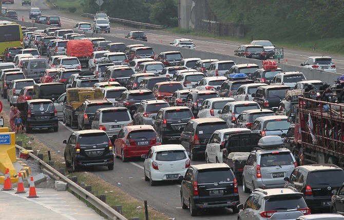 Kemacetan di tol Trans-Jawa arah Jakarta mengular hingga 5 km karena puncak arus mudik. (Raka Denny/Jawa Pos)