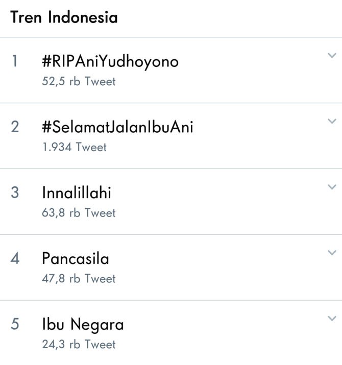 Saking derasnya ucapan duka atas meninggalnya Ibu Ani Yudhoyono, topik tersebut sampai menjadi trending. Pantauan JawaPos.com, tanda pagar atau tagar #RIPAniYudhoyono, #SelamatJalanBuAni, dan Ibu Negara berada di posisi lima teratas trending topik Twitter.