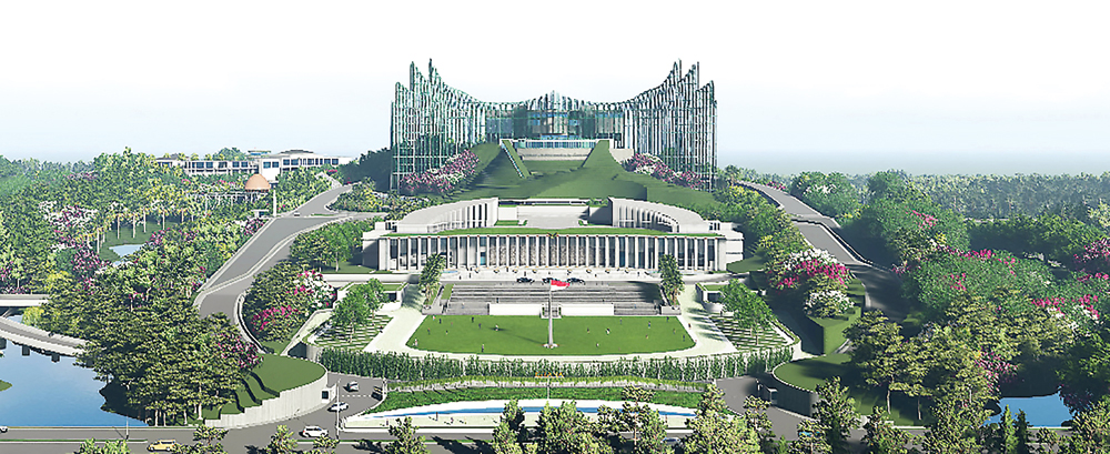 RAMAH LINGKUNGAN: Ilustrasi desain kantor istana kepresidenan yang akan dibangun di ibu kota negara (IKN) di Kalimantan Timur. Tahapan pembangunan rencana dimulai tahun ini. (NYOMAN NUARTA/AFP)