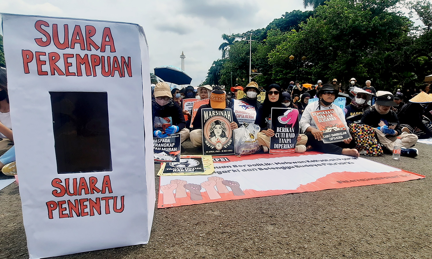 Ratusan perempuan tergabung dalam dari berbagai organisasi melakukan aksi unjuk rasa di kawasan Monas, Jakarta, Jumat (8/3/2024).