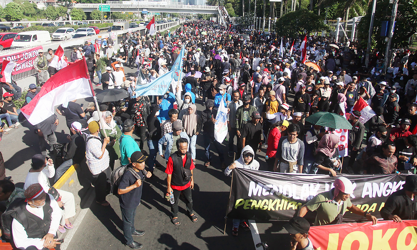 Pengunjuk berdemonstrasi menyampaikan aspirasinya di depan Gedung DPR, Senayan, Jakarta, Selasa (19/3/2024).