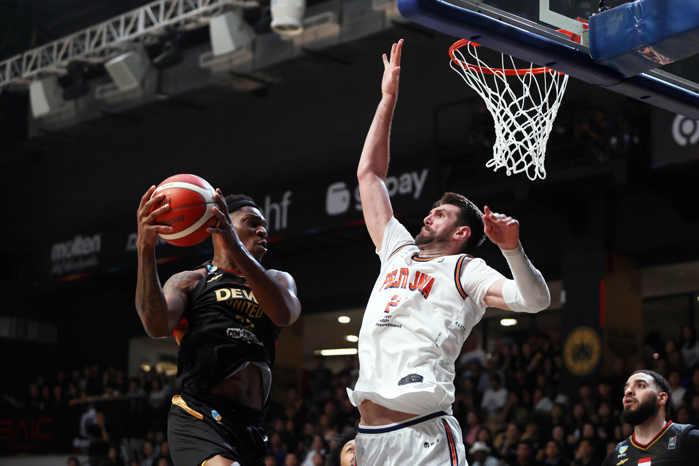 Dewa United Banten vs Pelita Jaya Jakarta pada pertandingan babak pertama final Indonesian Basketball League (IBL) 2025 di Dewa United Arena, Kabupaten Tangerang, Banten, Kamis (17/7/2025).