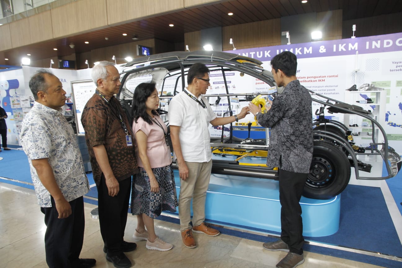 Dari kiri: Imron Hanafi, owner IKM PT Besq Sarana Abadi binaan Yayasan Astra – YDBA; Tonny Sumartono, Advisor Yayasan Astra – YDBA; Ema Poedjiwati Prasetio, Sekretaris Yayasan Astra – YDBA; Rahmat Samulo, Ketua Yayasan Astra – YDBA; dan Muhammad Orlando, Second Generation PT Noerhayat Berkah Sejahtera sedang melihat konstruksi sebuah mobil di Booth Yayasan Astra – YDBA di pameran GIIAS) 2025.