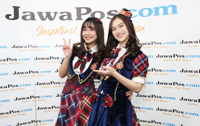 Dua member JKT48, Melody (kanan) dan Yuri (kiri), saat berkunjung ke JawaPos.com, Kamis (21/12).