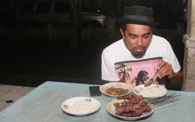 Glenn Fredly saat menyantap Sate Klathak Pak Bari