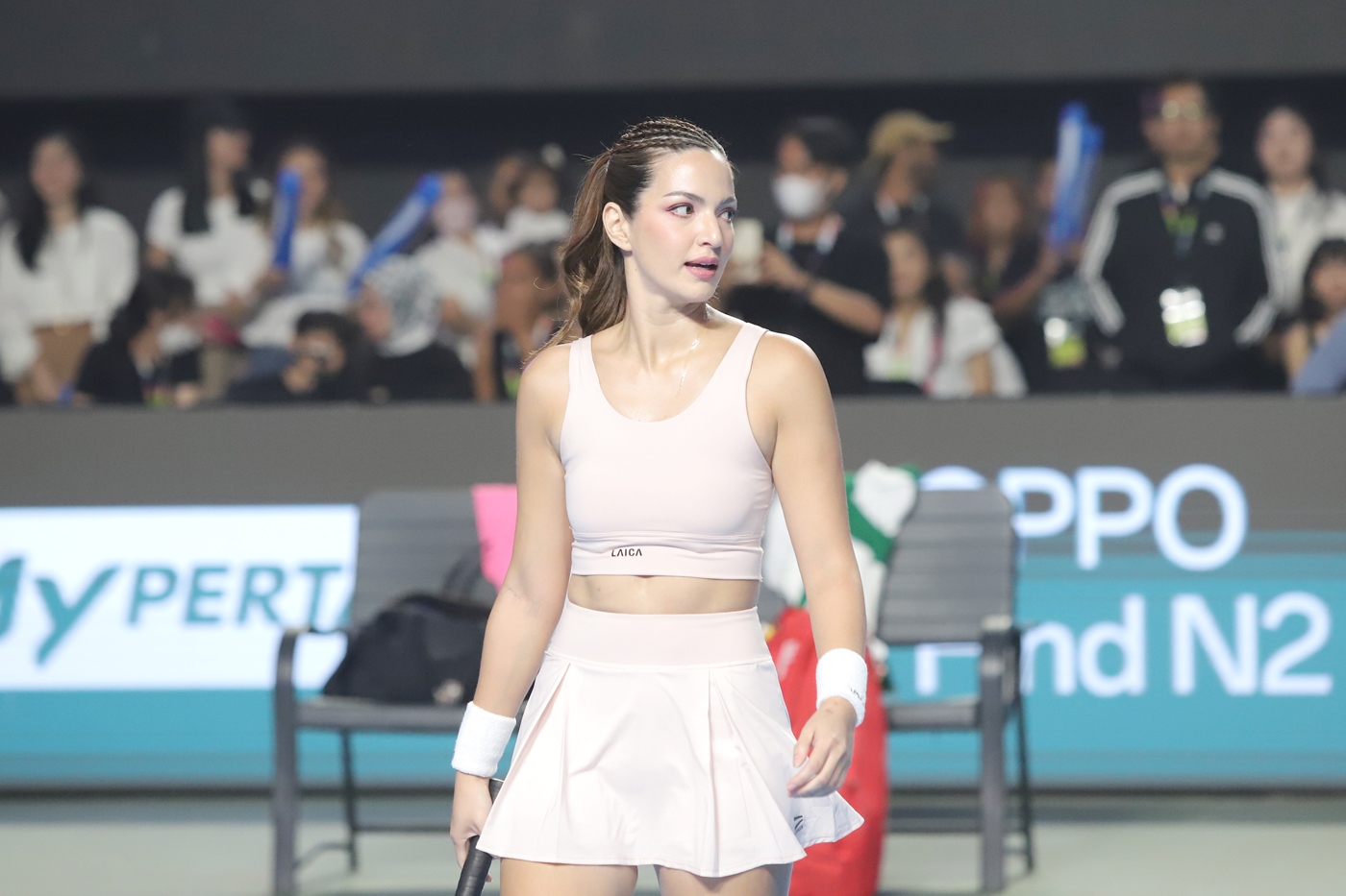 Pasangan ganda Luna Maya dan Nia Ramadhani saat pertandingan melawan Nagita Slavina dan Gege Elisa pada pertandingan Lagi-lagi Tenis di Tennis Indoor Senayan, Jakarta, Jumat (23/6/2023).