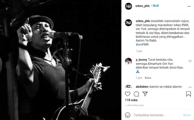 "Innalillahi wainnailaihi rojiun, telah berpulang mandoliner orkes PMR, om Yuri, semoga ditempatkan di tempat terbaik di sisi Nya, diberi ketabahan dan keikhlasan untuk yang ditinggalkan... Aamin Ya Rabb #omPMR," tulisnya memberi keteranan foto.