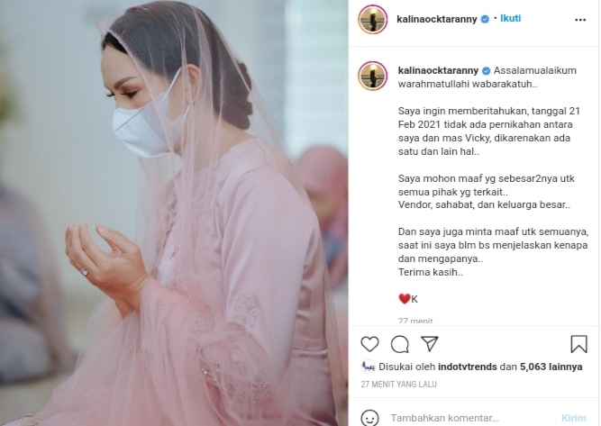 “Assalamualaikum warahmatullahi wabarakatuh. Saya ingin memberitahukan, tanggal 21 Februai 2021 tidak ada pernikahan antara saya dan mas Vicky, dikarenakan ada satu dan lain hal,” tulis Kalina sambil memposting foto dirinya dengan posisi kedua tangan diangkat laiknyai berdoa.