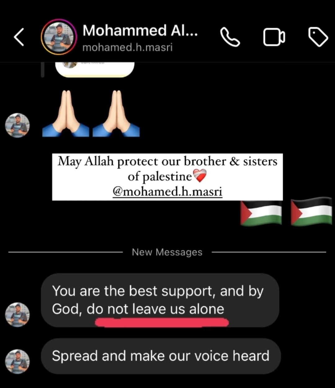 Melihat video Dara Arafah yang menggunakan drone dan memperlihatkan lautan manusia di sekitar Monas untuk membela Palestina, sang jurnalis terharu. Mohammed Al Masri mengirimkan pesan via direct message (DM) Instagram yang ditujukan pada Dara Arafah.